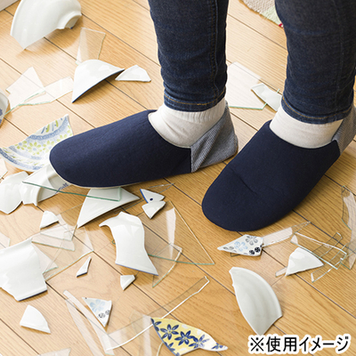 足裏あんしんルームシューズ。通常はルームシューズとして使用し、万が一の震災時にそのまま履いて避難しても、ガラスや釘などを通さない中敷きが入っているので、安心してご使用していただけます。軽くて柔らかい中敷きを採用しているので、通常の使用でもなんら違和感なくご使用になれます。
