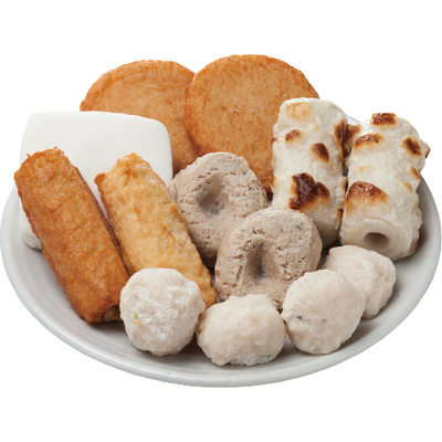 ソフトはんぺん、ごぼう巻、ぼたんちくわ、玉ねぎ揚、白身つみれ、さつま揚、小魚つみれが入っています。無リンすり身を使用。