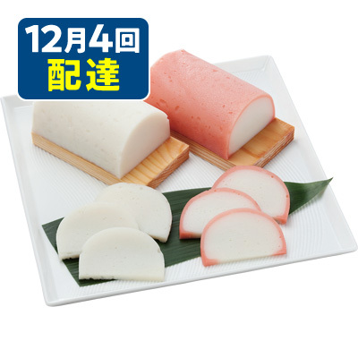 [赤蒲鉾](魚肉(たら(チリ)、ぐち(中国))、卵白(卵を含む、国産)、でん粉(小麦、馬鈴薯(国産))、砂糖、食塩、みりん、清酒、魚介エキス/着色料(紅麹))[白蒲鉾](魚肉(たら(チリ)、ぐち(中国))、卵白(卵を含む、国産)、でん粉(小麦、馬鈴薯(国産))、砂糖、食塩、みりん、清酒、魚介エキス)