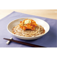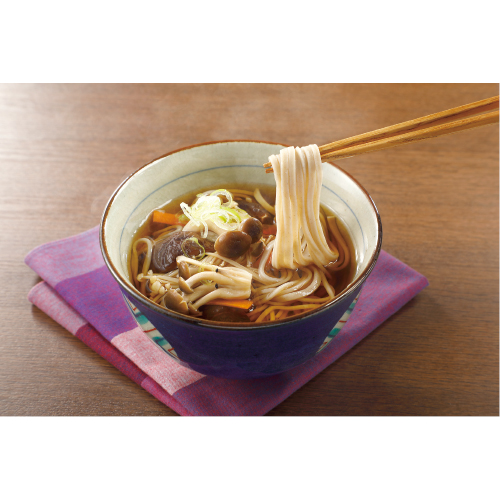 国産そば粉40%、国産小麦粉60%を配合した4割そば。そば粉は、実を丸ごとロール挽き製粉した「挽きぐるみそば粉(全層粉)」を使用。 冷凍ゆで麺でありながらそばの香りと食感が楽しめます。 ゆでたてを急速冷凍しています。冷凍のまま調理可能。ざるそば、かけそばはもちろん、食塩不使用なので鍋の〆(締め)そばにも。