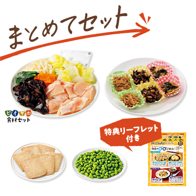 休日の昼・夜ごはんにぴったりの、約2人分の食事が手軽につくれるセットです。一つの注文で「国産大豆味付けいなり(消泡剤不使用)」、「3種の小さなカップ惣菜(和風)」、「冷凍ビオサポ 鶏肉と5種野菜の中華あん」「冷凍むきえだまめ」、昼・夜ごはんの作り方が書かれた「リーフレット」が届きます。別途ご用意いただく食材や調味料があります。国産大豆味付けいなり(消泡剤不使用)、冷凍むきえだまめは使い切り量ではありません。残った分は別途ご活用ください。