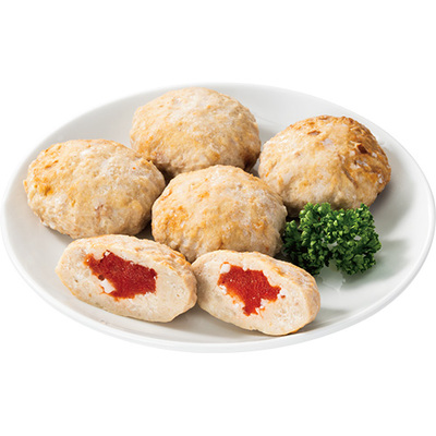 提携先の牛肉、豚肉を使用したハンバーグの中にトマトソースを入れました。必要分を切り離して使えます。お弁当に割って入れてソースの赤を彩りにしても。原料の高騰を受け、容量を6個から減らし値上げ幅を抑えて取組みます。また、アレルゲンが変わります。
