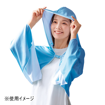 日差しが気になったらサッと羽織るだけでUV対策。接触冷感生地でサラッと快適です。暑い日には濡らして振るだけ、気化熱の原理でクールタオルとしても使えて便利です。パッケージは収納ポーチとして使えます。ボタンはマグネット仕様で、お子様でも簡単に羽織れます。