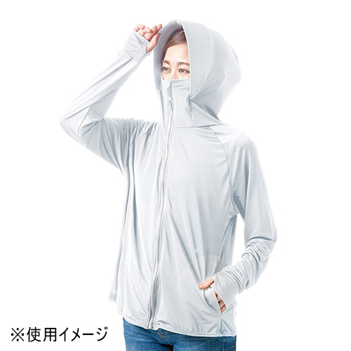 頭から手の甲まで360度紫外線からプロテクトするパーカーです。地面からの照り返し、上からの紫外線からもしっかりガード。大きめのフードだから髪型も気になりません。鼻先まで付いたファスナーで顔まですっぽり隠せます。ボディラインが出にくいゆったりサイズです。