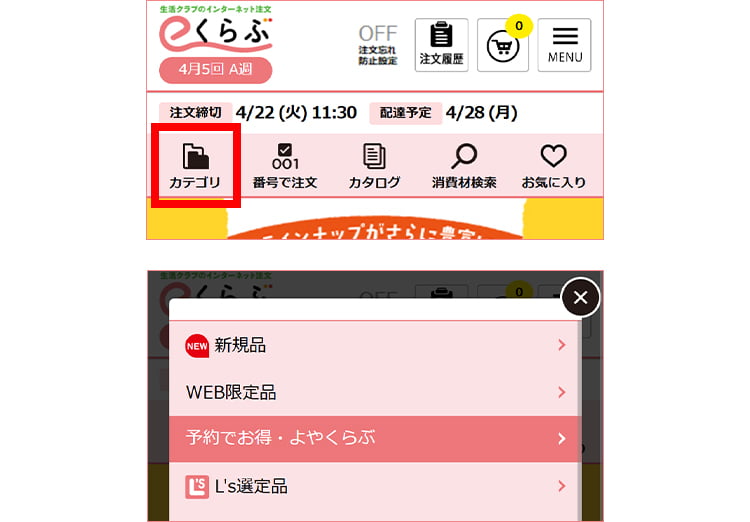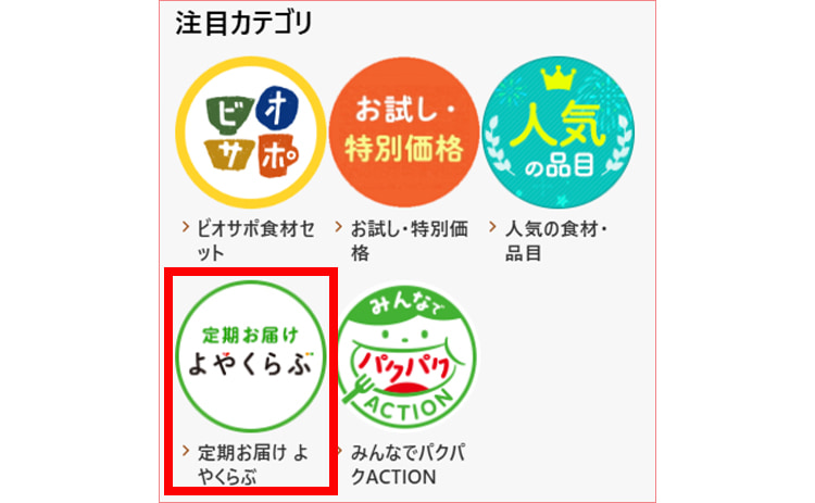 ホーム画面の「注目カテゴリ」にある「定期お届け よやくらぶ」をタップ