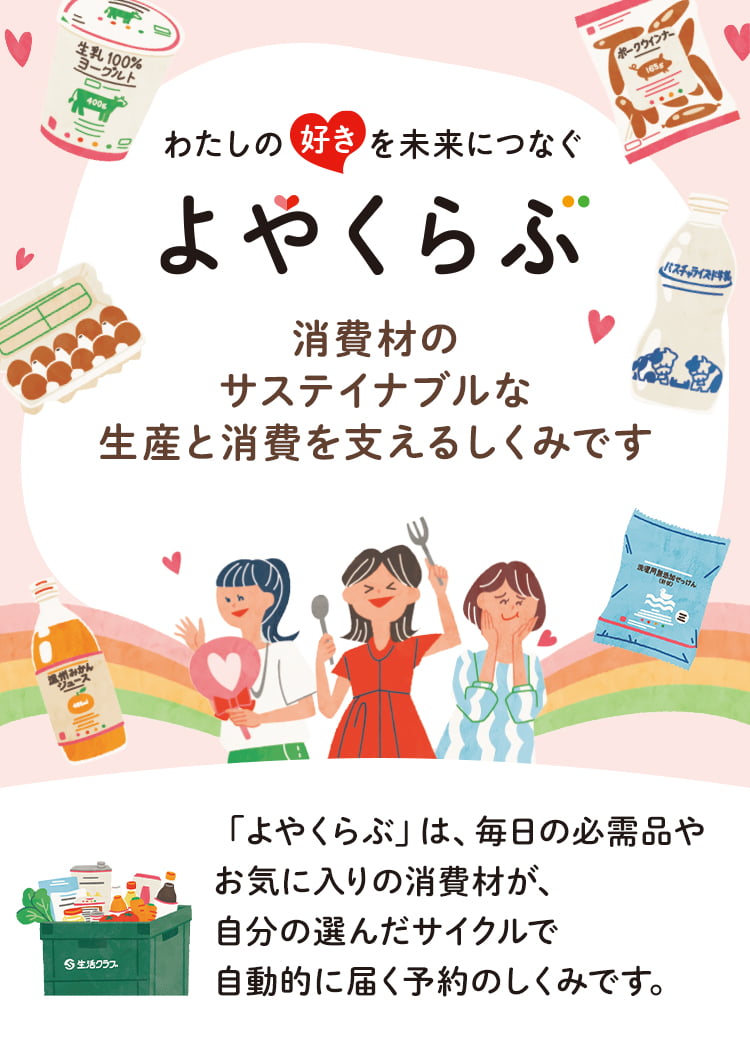 品目ごとに登録できる配達サイクルが異なります。品目ごとの配達サイクルは、上記のよやくらぶカタログ、または、eくらぶの「よやくらぶに登録」ボタンをタップすると表示される「よやくらぶ登録」画面でご確認ください。