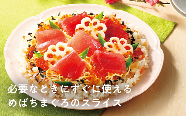 日本漁船が遠洋で漁獲しためばちまぐろを鉄火丼や手巻き寿司などに便利なスライスに。必要なときにすぐに使えます。1袋丼2人前程度。
