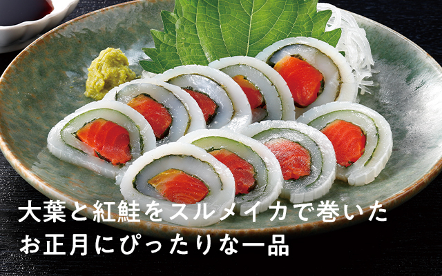 大葉と紅鮭をスルメイカで巻いて凍結し、5mm幅にカットしました。北海道産のスルメイカ、アラスカ産の紅鮭、国産の大葉を使用しています。彩り鮮やかでおせちの1品にぴったりです。冷蔵庫で3〜4時間解凍してください。好みで醤油をつけて刺身としてどうぞ。1袋に約14〜17枚入り。
