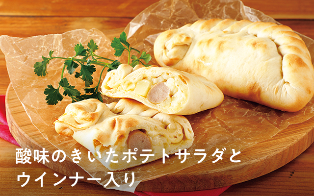 消費材のマヨネーズで味付けしたポテトと、消費材のポークウインナー、モッツァレラチーズを国産小麦を使用した生地で包んで焼きました。電子レンジで温めるだけで手軽に食べられます。軽食や小腹がすいたときなどに。