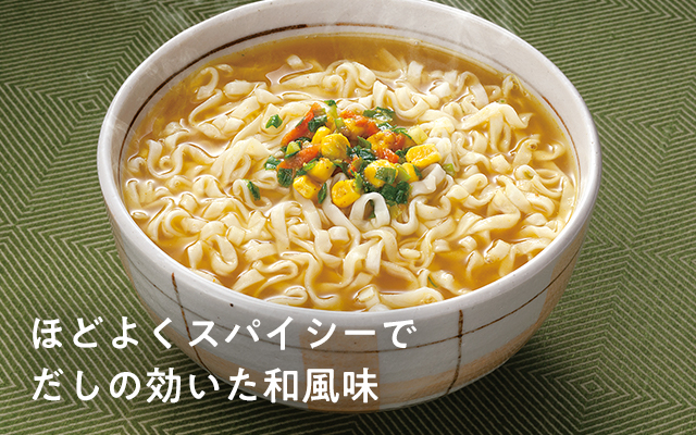 国産小麦の即席麺にかつおだしの効いた和風カレー味のスープ。緊急時は粉末スープを溶かしながら水を注いで約20分ほどで食べられます。水がない場合は、麺をくだいて粉末スープを混ぜればスナック代わりに。
