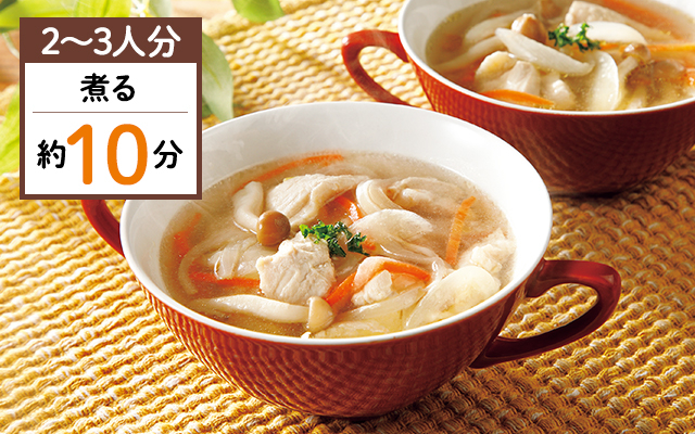 具だくさんのミネストローネ。鶏肉と大豆からたんぱく質が摂れるスープです。大豆は食物繊維と鉄も豊富。じゃがいもや野菜とともにトマト味でまとめました。鶏肉と大豆が入ることで満足感のある一品。2〜3人分。調理時間:約15分。家庭で用意するもの:オリーブ油大さじ1、塩・こしょう各少々、水600ml。調理法:煮る※使い切りのセットです。レシピ付き。必ず加熱してください。消費期限はお届け日の翌日です。