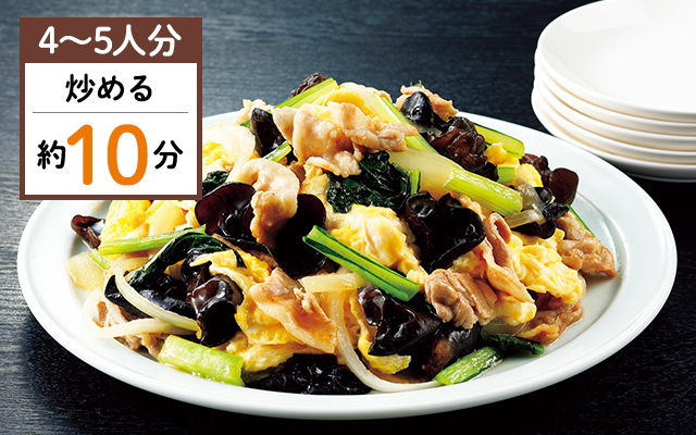 中華風の塩炒め。水煮のきくらげを使うからすぐ炒められます。フライパンひとつで調理可能。豚肉のビタミンB1の吸収を、玉ねぎのアリシンが高めます。きくらげは食物繊維やビタミンDが豊富。4〜5人分。調理時間:約10分。家庭で用意するもの:なたね油大さじ2(卵用)、ごま油大さじ2、塩、こしょう各少々、卵4〜5個。調理法:炒める※使い切りのセットです。レシピ付き。必ず加熱してください。消費期限はお届け日の翌日です。