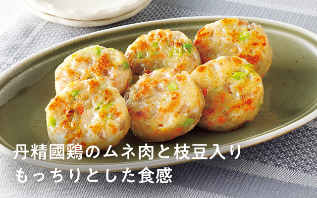 丹精國鶏のムネ肉と豆腐などでつくった生地に、レンコン、枝豆、人参を入れ、醤油や塩などでシンプルに味付けしました。フライパンや電子レンジで温めるだけで食べられます。お弁当にも便利なサイズ。10個入り。野菜と一緒に炒めたり、煮物の具材にも。