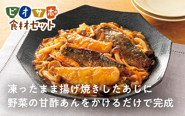 あじにはカルシウムの吸収を助け、筋力の維持に関わるビタミンDやDHA・EPAが豊富。酢豚ソースの野菜あんがよく合います。2人分。調理時間:約15分。家庭で用意するもの:なたね油大さじ2。調理法:炒める※使い切りのセットです。レシピ付き。必ず加熱してください。消費期限はお届け日の翌日です。