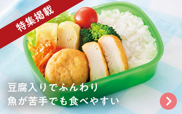 三陸沖で獲れたカナガシラの魚肉に提携先の木綿豆腐などを混ぜ、ニンニクなどで味付けして揚げました。子どもも食べやすい味つけです。自然解凍でお弁当にも。そのままでも食べられますが、ケチャップなどをつけるのもおすすめです。
