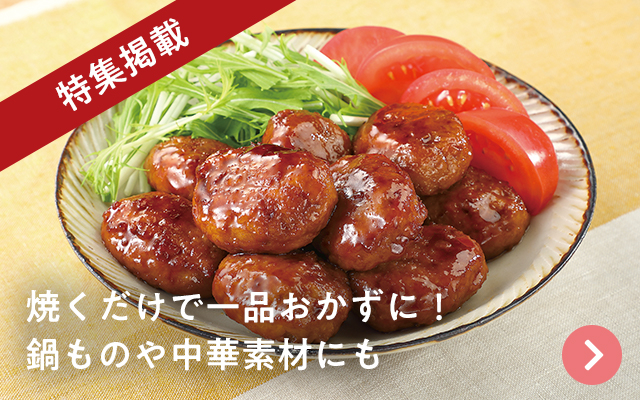 消費材の豚肉を使用したミニサイズのポークハンバーグ。提携先の原料を使い、味付けに一工夫してあるので、冷めてもおいしく食べられます。凍ったままフライパンで焼くだけなのでお弁当にも便利。ロールキャベツや煮込み料理などにも活用できます。
