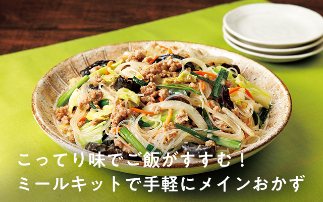 豚ひき肉をほぐしながら炒めて野菜を加え、春雨、添付の豚骨炒めだれで仕上げます。豚肉に豊富なビタミンB1が春雨の糖質をエネルギーに代謝します。きくらげと野菜から様々なビタミンと食物繊維が摂れる一品。2〜3人分。調理時間:約10分。家庭で用意するもの:なたね油大さじ1。調理法:炒める※使い切りのセットです。レシピ付き。必ず加熱してください。消費期限はお届け日の翌日です。利用促進のため11月2回価格に対し20円引き。