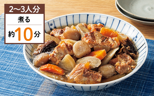 鍋に具材とミックス野菜を液ごと入れ水を加えて強火で煮立たせ、豚軟骨を軽く混ぜながら強火で煮込むだけ。味がしみた煮物が手間なく作れます。たんぱく質や鉄、亜鉛等を含む豚なんこつのやわらかくとろりとした食感で野菜の食物繊維を摂りやすく。2〜3人分。調理時間:約10分。家庭で用意するもの:水50ml調理法:煮る※使い切りのセットです。レシピ付き。必ず加熱してください。