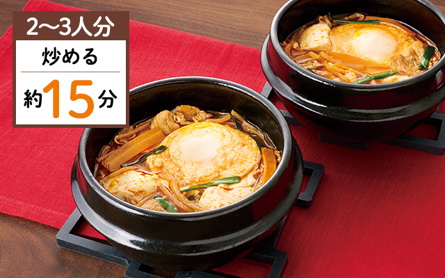 具材を炒め、水と添付のチゲスープを加えて煮るだけ。韓国風の旨辛スープで、たんぱく質が豊富な豚肉や豆腐、食物繊維や葉酸などのビタミンを含む野菜を、たっぷりと食べられます。2〜3人分。調理時間:約15分。家庭で用意するもの:ごま油大さじ1、水500ml、卵お好みで。調理法:炒める※使い切りのセットです。レシピ付き。必ず加熱してください。消費期限はお届け日の翌日です。