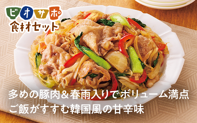 豚肉入りの他のセットよりお肉が多め。豚肉からたんぱく質、春雨と野菜から食物繊維が摂れる韓国風おかず。とうがらしは不使用。2〜3人分。調理時間:約10分。家庭で用意するもの:ごま油大さじ1、お好みで白ごま。調理法:炒める※使い切りのセットです。レシピ付き。必ず加熱してください。消費期限はお届け日の翌日です。