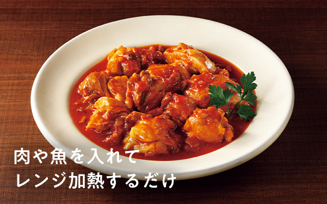 鶏肉などの具材300〜350gを本品に入れてレンジで加熱するだけで、手軽に2〜3人分のトマト煮込みが作れます。トマトペーストをベースに、国産の玉ねぎ、しめじ、にんにくを合わせ、生活クラブの提携生産者のトマトケチャップ、牡蠣味調味料、塩、なたね油などを使用して作りました。具材投入口は幅広でチャック付き、底が広がるスタンディングパウチです。加熱時間を調整すれば、加える食材は冷蔵、冷凍どちらでも使えます。鶏肉のほか魚や野菜でトマト煮にするなど、具材によって様々なアレンジができます。