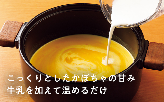 北海道産のかぼちゃ、国産の玉ねぎ、生クリームなどを使用した濃縮タイプのスープ。同量の牛乳を加えて温めるだけで、かぼちゃの甘味が味わえる濃厚なスープに。約4人分。利用促進のため1月3回価格に対し21円引き。