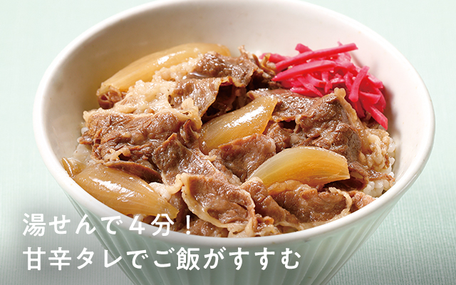 消費材の牛肉、国産玉ねぎをタレで煮込んだミニタイプの牛丼の具。電子レンジ加熱または湯せんで食べられます。