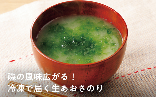 水揚げされたあおさのり(ヒトエグサ)を生のまま凍結。加熱、乾燥はしていないので生ならではの香りとトロッとした食感が楽しめます。味噌汁や卵焼きに入れるほか、お吸い物やパスタ、ラーメンのトッピングなど幅広く使用できます。便利なチャック付き袋入りでパキッと折り曲げれば使いたい分だけ取り出せます。