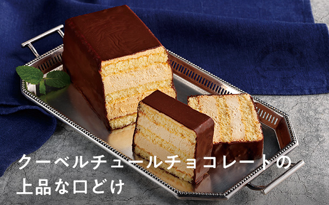 スポンジにキャラメル風味のクリームをサンドし、クーベルチュールチョコレートでコーティングした上品な甘さのチョコレートケーキです。国産の小麦、鶏卵、牛乳を使用。冷蔵庫で3〜4時間自然解凍してください。サイズは約6cm×15cm×高さ約5cm。