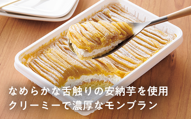 提携生産者の鶏卵を使用して焼いたスポンジに北海道十勝産生クリームをのせ、国産安納芋餡を絞った3層のケーキ。好みの量をすくって食べるスコップモンブランです。安納芋の濃厚な味わいと、生クリーム、しっとりしたスポンジの調和が楽しめます。洋酒を使用しています。解凍目安は冷蔵庫で約2時間。サイズは12cm×18cm。約3〜4人分。