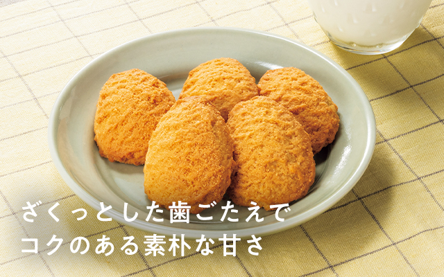 国産小麦粉、提携生産者の鶏卵、マーガリン、ビートグラニュー糖を使用。ほどよい甘みとざくざくした食感が楽しめます。おやつや小腹がすいたときに。1個の大きさは、約5.5cm×4cm。1袋に約19個入り。