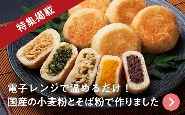 国産の小麦粉とそば粉で作った、皮の香ばしさが引き立つ揚げ焼きタイプ。電子レンジで温めるだけで、できたてを味わえます。