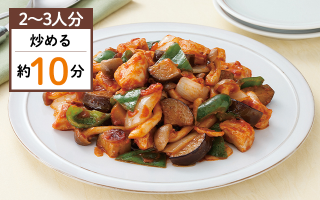 小鍋に水と添付の煮物つゆを入れて沸かし、事前に解凍して片栗粉をまぶした鶏肉を少しずつ加えて火を通し、揚げなす、人参、いんげんを加えて仕上げます。揚げる手間いらずの揚げなすのとろける食感とコク、たんぱく質源の鶏ムネ肉の旨みを家庭で用意する片栗粉のとろみでまとめます。揚げなすは消費材の「国産揚げなす(乱切り)」です。2人分。調理時間:約10分。家庭で用意するもの:水200ml、片栗粉大さじ1と1/2。調理法:煮る※使い切りのセットです。レシピ付き。必ず加熱してください。