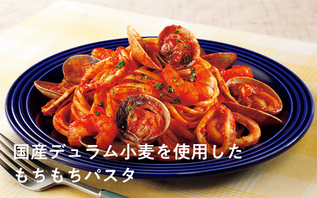 国産デュラム小麦のセモリナを使用した、素朴でもっちりとした食感のパスタです。平たいパスタなのでソースとよく絡み、ジェノベーゼソースやクリームソースなど濃厚なソースとよく合います。ゆで時間6分。利用促進のため3月4回価格に対し31円引き。