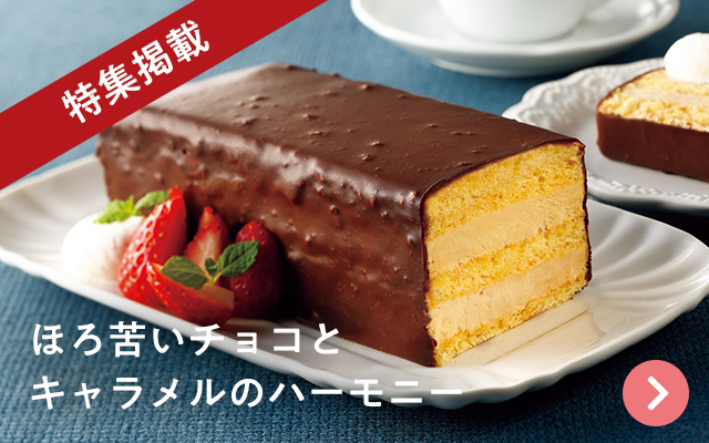 スポンジにキャラメル風味のクリームをサンドし、クーベルチュールチョコレートでコーティングした上品な甘さのチョコレートケーキです。国産の小麦、鶏卵、牛乳を使用。冷蔵庫で3〜4時間自然解凍してください。サイズは約6cm×15cm×高さ約5cm。利用促進のため2月1回価格に対し53円引き。