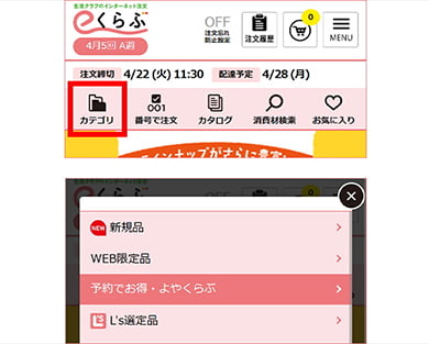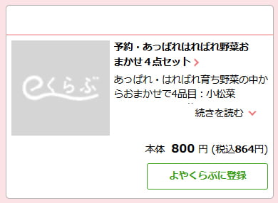 - 次週に配達される品目が事前にわかります。食べるカタログでは野菜ページの通常注文の「あっぱれ・はればれ野菜6点セット」で確認できます。eくらぶ・アプリでは、よやくらぶ登録対象品一覧(ログイン後)で確認できます。