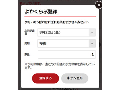 「野菜セット」を選択後、「よやくらぶに登録」をタップ